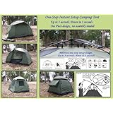 One piece instant set up 4 person family camping tent, new taller design (150 cm height) for tall customers. Setup in 3 seconds, takes down in 5 second, simply hook up 2 durable fiberglass bars, the tent is set and ready to use within 3 seconds. This unique patented design make the camping easier with more funs. Constructed with durable 190T with PU coated 2000mm nylon and UV 50+ protective material to block the harmful UV rays, the nylon also meet CPAI-84 fire retardant standard. Two large double waterproof windows with mesh and roof circular mesh to keep the insects outside and fresh air breezing through. An easy hoop up, PU coated 2000mm rain fly is included in the package for raining day. D shape front zipper door with mesh, PE 120 waterproof floor. Light weight only 11 lb, durable fiberglass frames ; tent comes with a carrying bag stakes and ropes. Dimensions: 260cm or 102.3" (L) x 230cm or 90.5" (W) x 150cm or 59" (H). Package size: 80cm or 31.5" (L) x 20cm or 8"(W)x 20cm or 8"(H). This family camping tent is large enough for 4 adults or many many kids to use, it can be easily and quickly setup that no other tent can compare. Please see the youtube video of the setup and folds down process:"http://www.youtube.com/watch?v=FxB564Zedos"Note:The dome top rainfly is included in the package, this rainfly is to cover the tent top mesh areas.